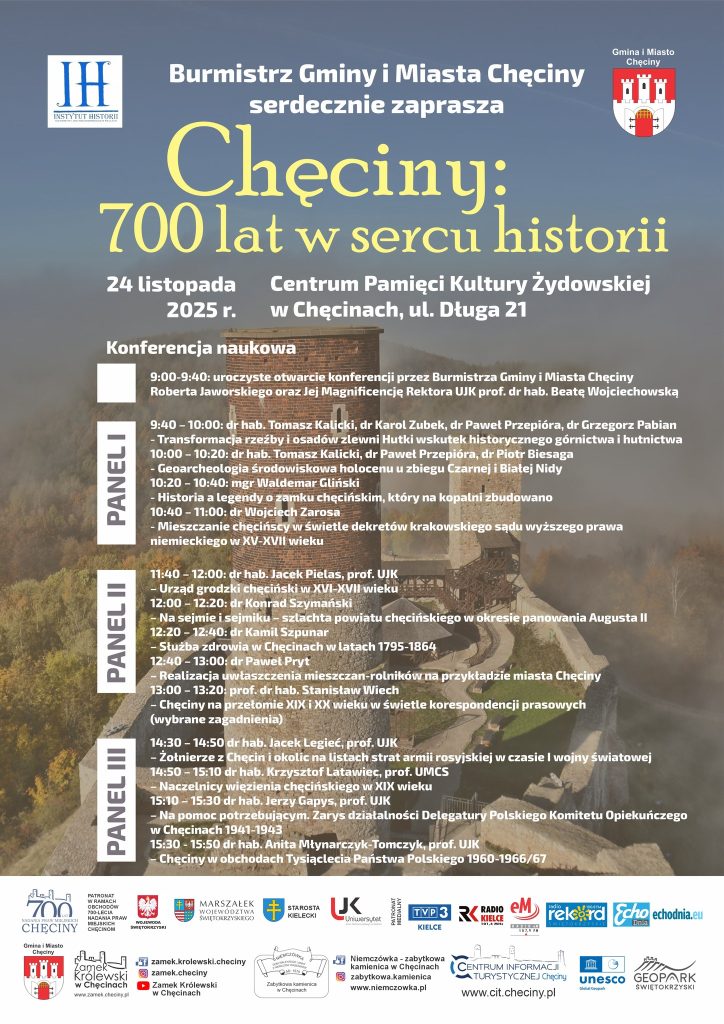 W imieniu Urzędu Gminy i Miasta Chęciny zapraszamy na konferencję naukową pt. „Chęciny: 700 lat w sercu historii”. Wydarzenie odbędzie się 24 listopada 2025 r. (poniedziałek) w Centrum Pamięci Kultury Żydowskiej w Chęcinach przy ul. Długiej 21. Wstęp wolny.