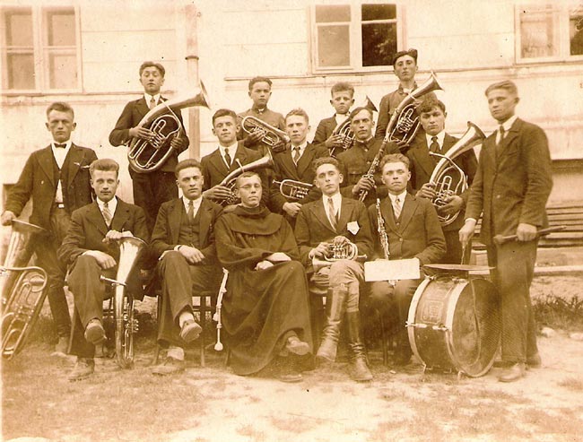 W pierwszym rzędzie w środku stoją: O. Augustyn Chadam i proboszcz