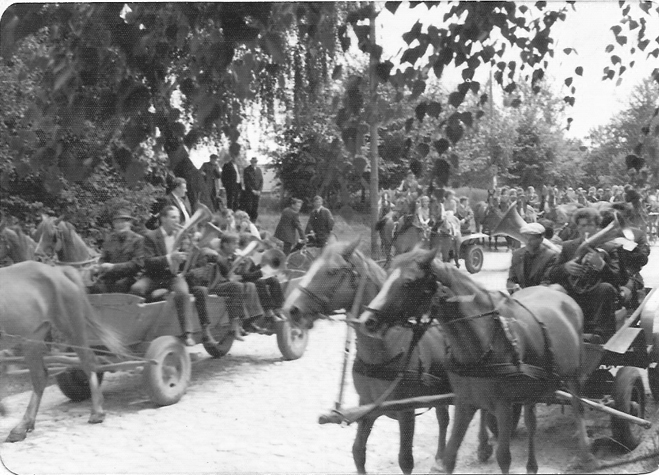 Wyjazd młodej pary do ślubu. Na pierwszej furmance orkiestra dęta, na drugiej państwo młodzi na pozostałych goście