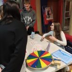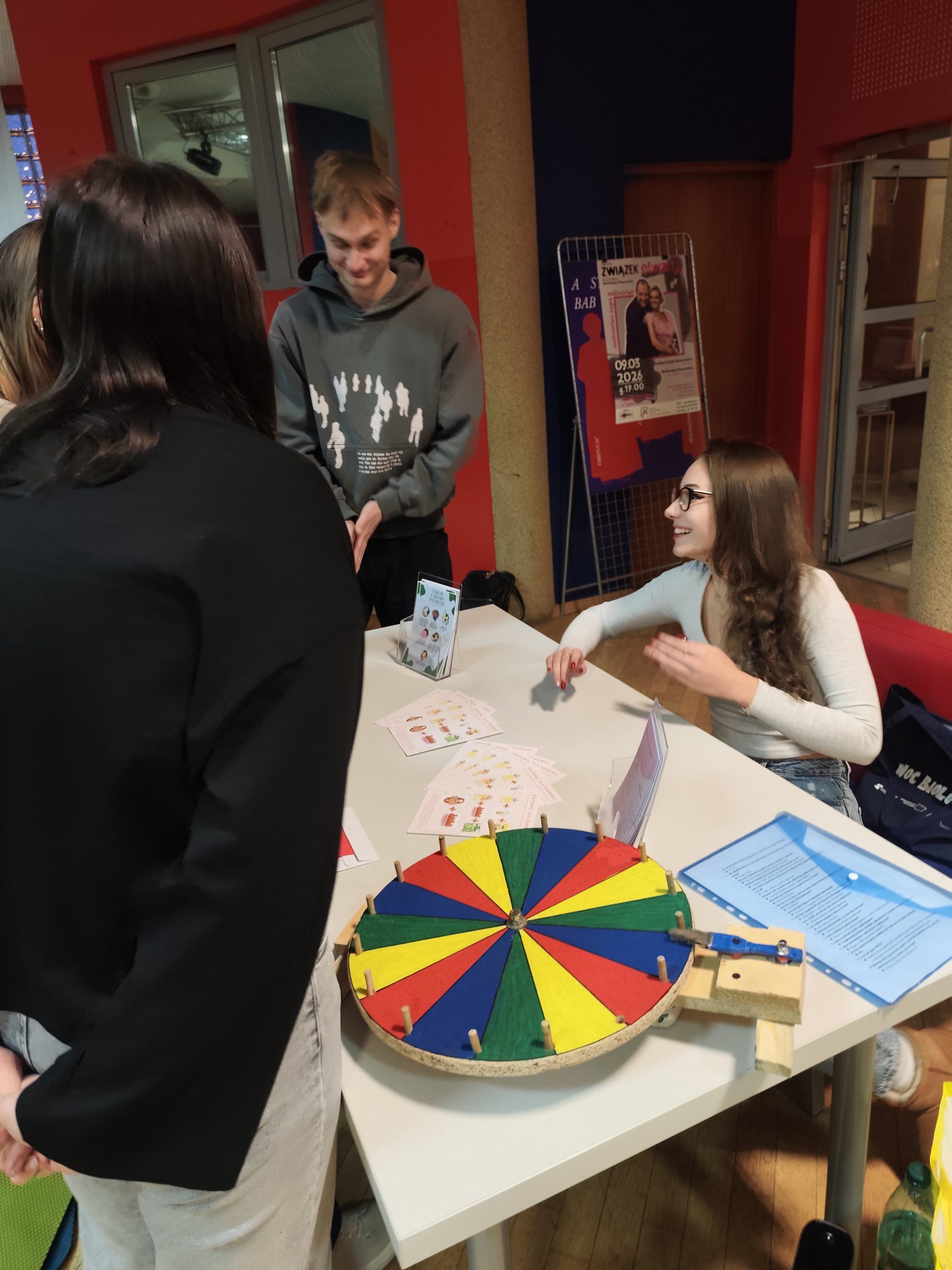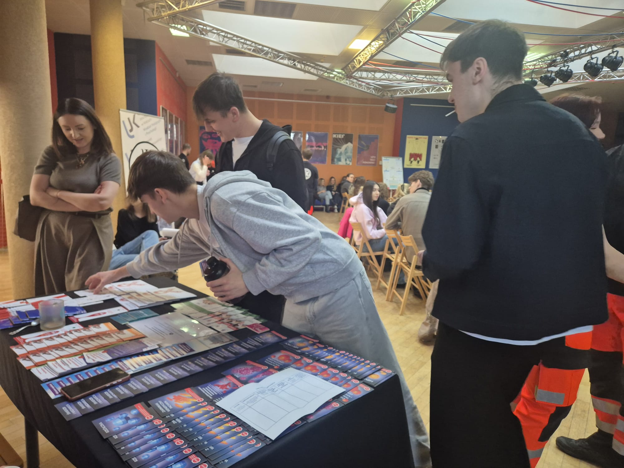 - Studenci przy stoisku z ulotkami o profilaktyce ryzykownych zachowań seksualnych.