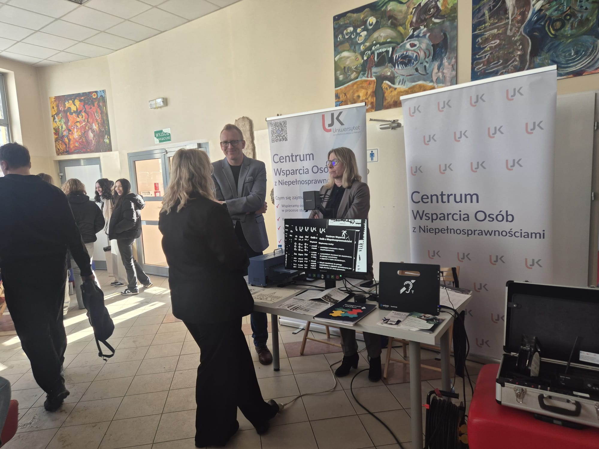 - (od lewej) mgr Sebastian Grabek i mgr Izabela Waliszewska – Plewa przy stoisku Uniwersyteckiego Centrum Wsparcia dla Osób z Niepełnosprawnościami.