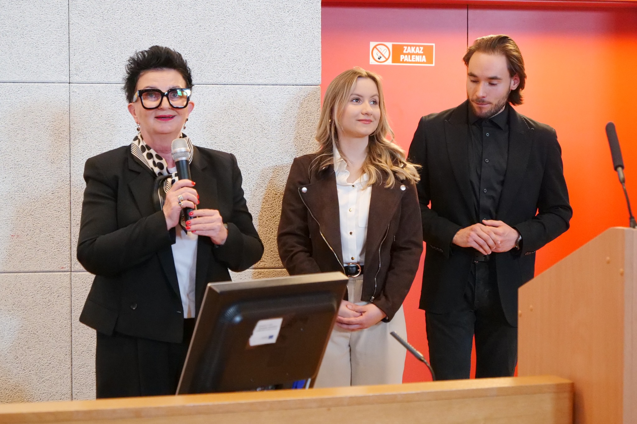 - Przybyłych gości powitali (od lewej): prorektor ds. kształcenia prof. Mariola Wojciechowska, przewodnicząca Wydziałowej Rady Samorządu Studentów Weronika Misztal i jej zastępca Hubert Bukowski.