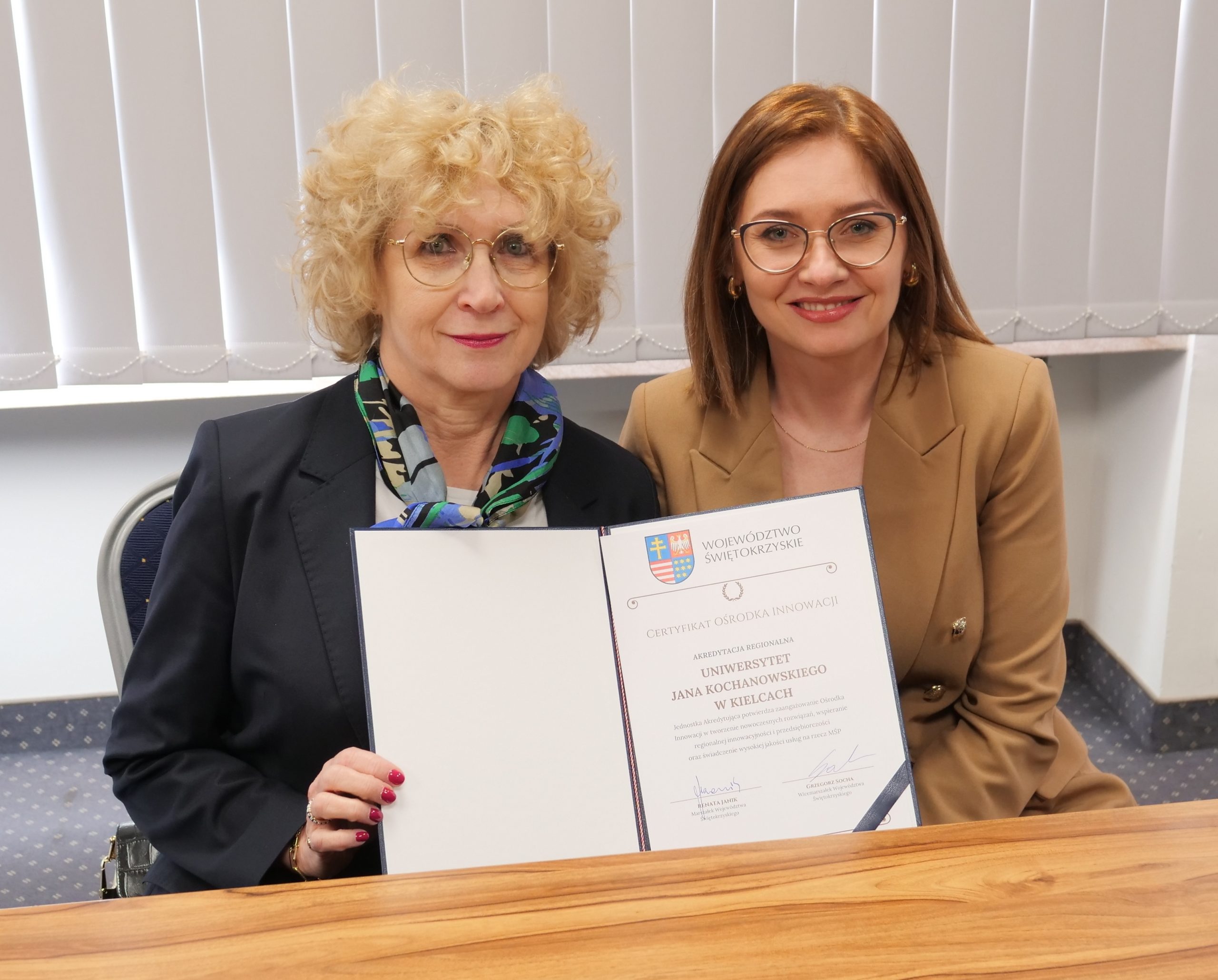 Uniwersytet Jana Kochanowskiego uzyskał akredytację regionalną w województwie świętokrzyskim i tym samym nasza Uczelnia znalazła się na liście Ośrodków Innowacji. W siedzibie urzędu marszałkowskiego Certyfikat Ośrodka Innowacji odebrały prof. dr hab. Beata Wojciechowska, rektor Uniwersytetu Jana Kochanowskiego i Izabela Zielińska, kierownik Działu Innowacji i Transferu Technologii UJK.