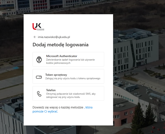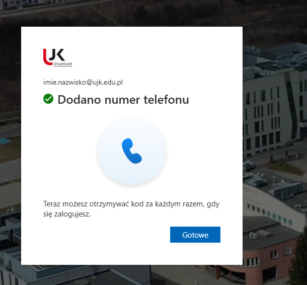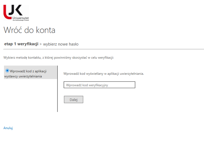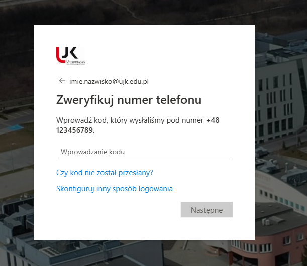 Wybór aplikacji Microsoft Authenticator lub telefon i wiadomość SMS przez użytkowników, logujących się do konta Microsoft 365 spoza sieci UJK, jest równoznaczne z wyrażeniem zgody na wykorzystanie numeru telefonu w celu uwierzytelnienia wieloskładnikowego podczas logowania do zasobów UJK.