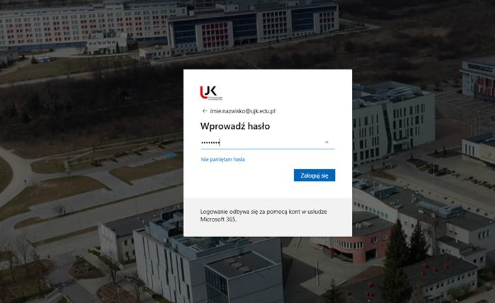 Wpisz hasło do konta uczelnianego Microsoft 365 i kliknij Zaloguj.