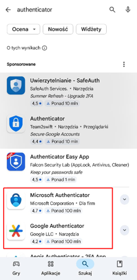 Zalecance pobranie aplikacji Microsoft Authenticator (możliwe jest użycie aplikacji Google Authenticator – zasada działania taka sama). Proszę nie instalować innych aplikacji!