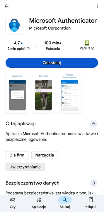 Instalacja aplikacji Microsoft Authenticator jest dobrowolne i służy wyłącznie do potwierdzenia tożsamości użytkownika.