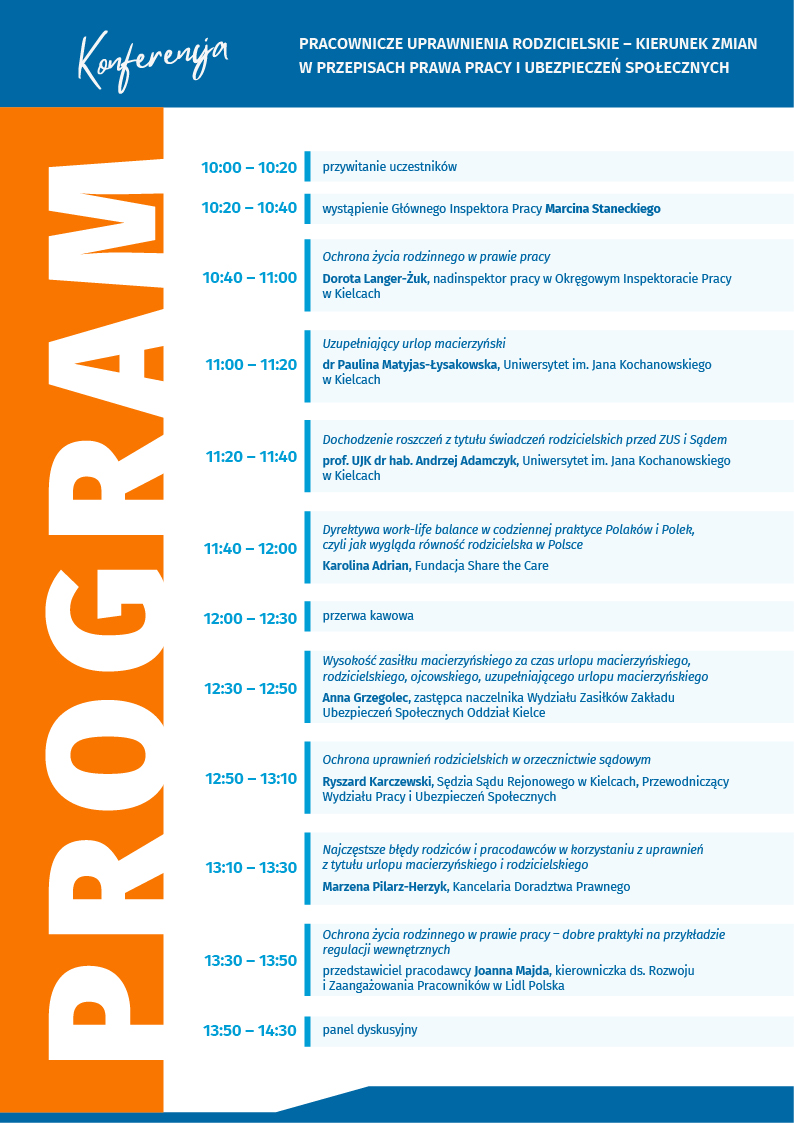 Program Konferencji i formularz rejestracyjny są dostępne na stronie: https://kielce.pip.gov.pl/aktualnosci/konferencja-pracownicze-uprawnienia-rodzicielskie