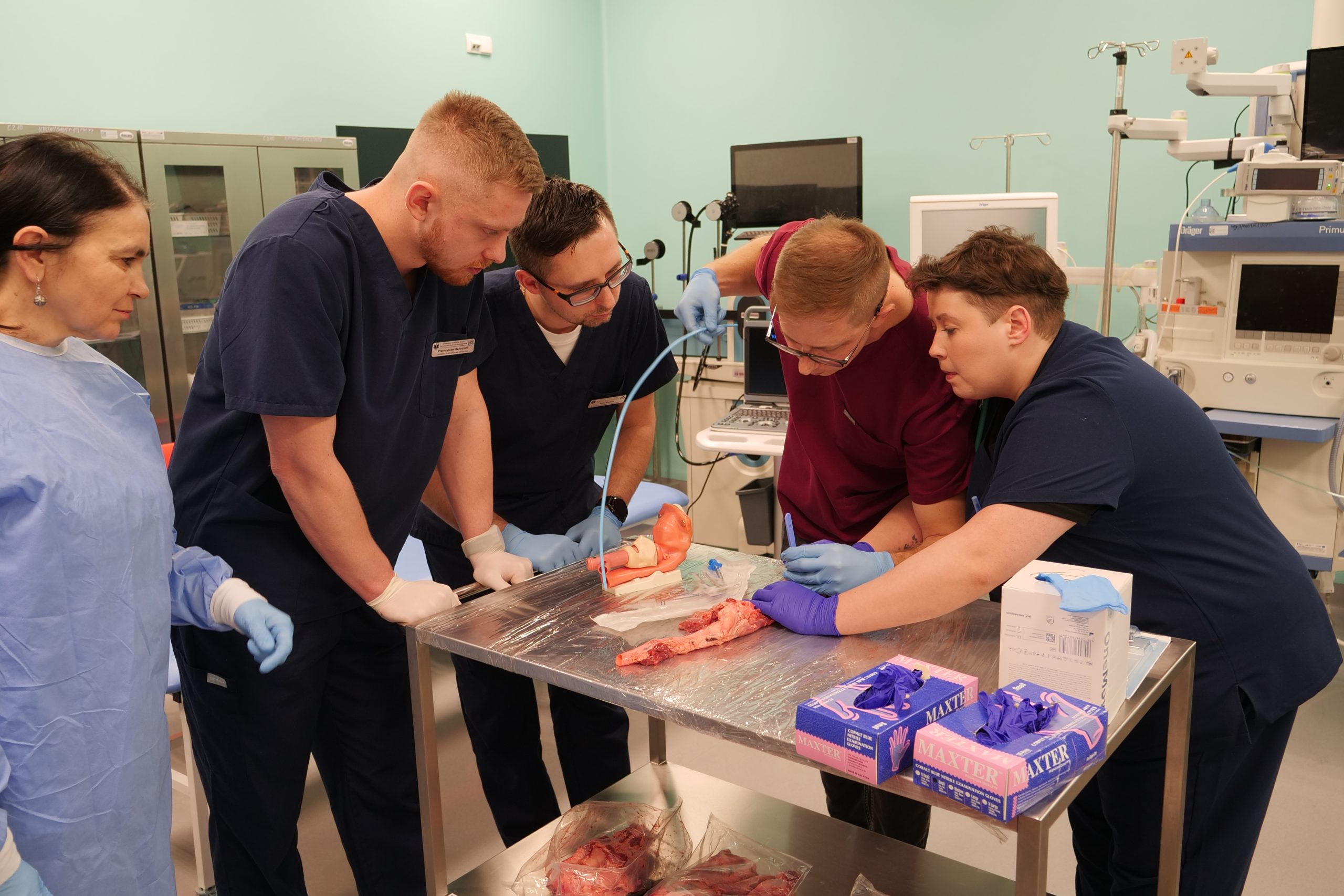W pierwszym dniu warsztatów uczestnicy wzięli udział w zajęciach kadawerowych prowadzonych przez pracowników Zakładu Anatomii CM UJK oraz studentów z SKN „Insula”, w trakcie których zapoznali się ze szczegółową anatomią klatki piersiowej, m.in. serca i dróg oddechowych, pod kątem procedur inwazyjnych ratujących życie. W drugim dniu warsztatów prof. Iwona Gorczyca–Głowacka zapoznała uczestników z podstawowymi procedurami kardiologicznymi w pracy ratownika medycznego, a dr Mateusz Putowski z Zakładu Medycyny Ratunkowej poprowadził część kliniczną dotyczącą zagadnienia „Trudne drogi oddechowe według Difficult Airway Society 2025 guidelines”. W trakcie tej części studenci pod okiem dr. Putowskiego wykonali zabieg konikotomii i konikopunkcji na preparatach mokrych.